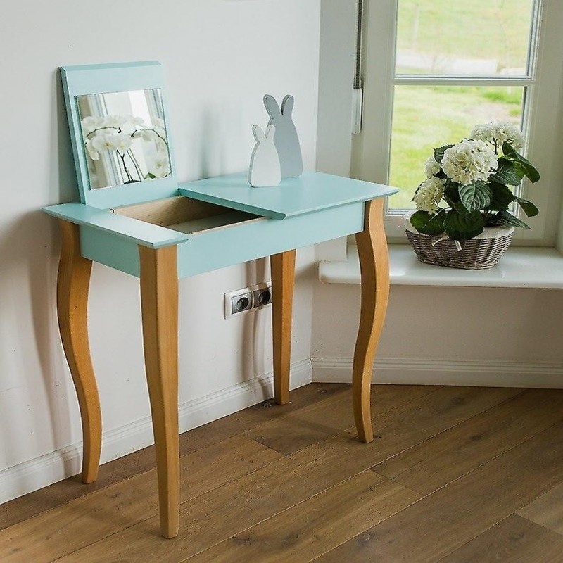 Der Frisiertisch ist aus Buchenholz und laminiertem und lackiertem MDF gefertigt. Dies macht es nicht nur zu einem formschönen Möbelstück, sondern auch zu einem langlebigen Produkt. Die farbenfrohen Beine sind in einem stilvollen Schwarz gehalten und die Tischplatte ist 19 mm dick, was ihr ein robustes und solides Aussehen verleiht.