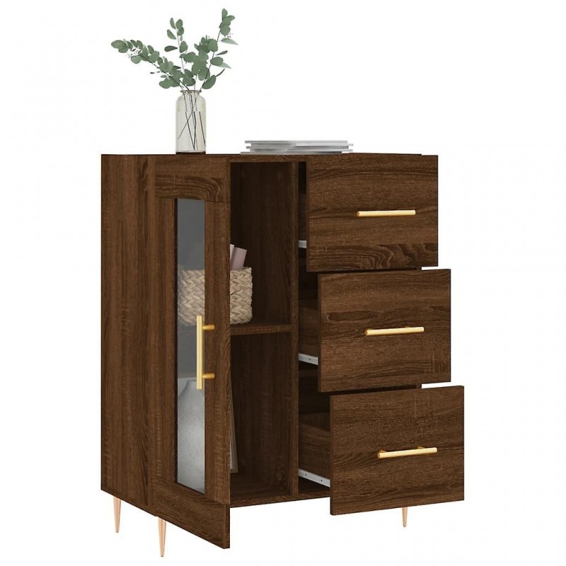 Farbe: Braune Eichenoptik. Material: Holz, Metall, Glas. Maße: 69,5 x 34 x 90 cm (B x T x H). Montage erforderlich: Ja. Rechtliche Dokumente: